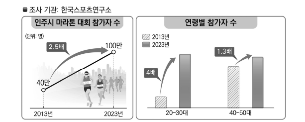 その結果、仁州市マラソン大会の参加者数は、2013年の40万人から2023年には100万人へと2.5倍増加したことが分かった。これを年齢別に見ると、20〜30代は過去10年間で4倍増加した一方、40〜50代は同期間に1.3倍の増加にとどまった。