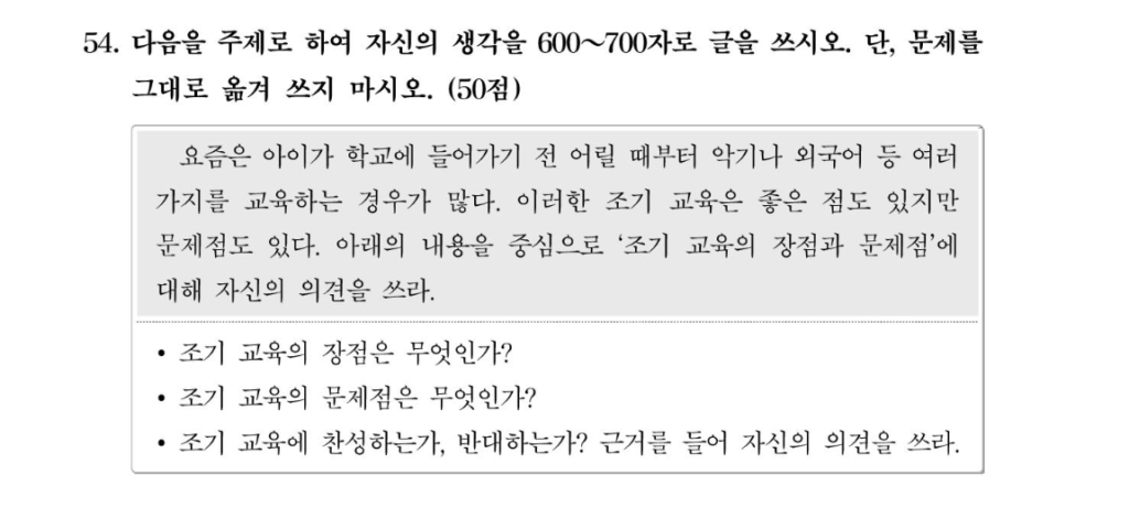 また、設問に沿って内容を整理し、自身の立場を明確に示すことで、安定した得点につながります。쓰기54はパターン化された構成で対応できるため、型を理解し、繰り返し練習することが重要です。